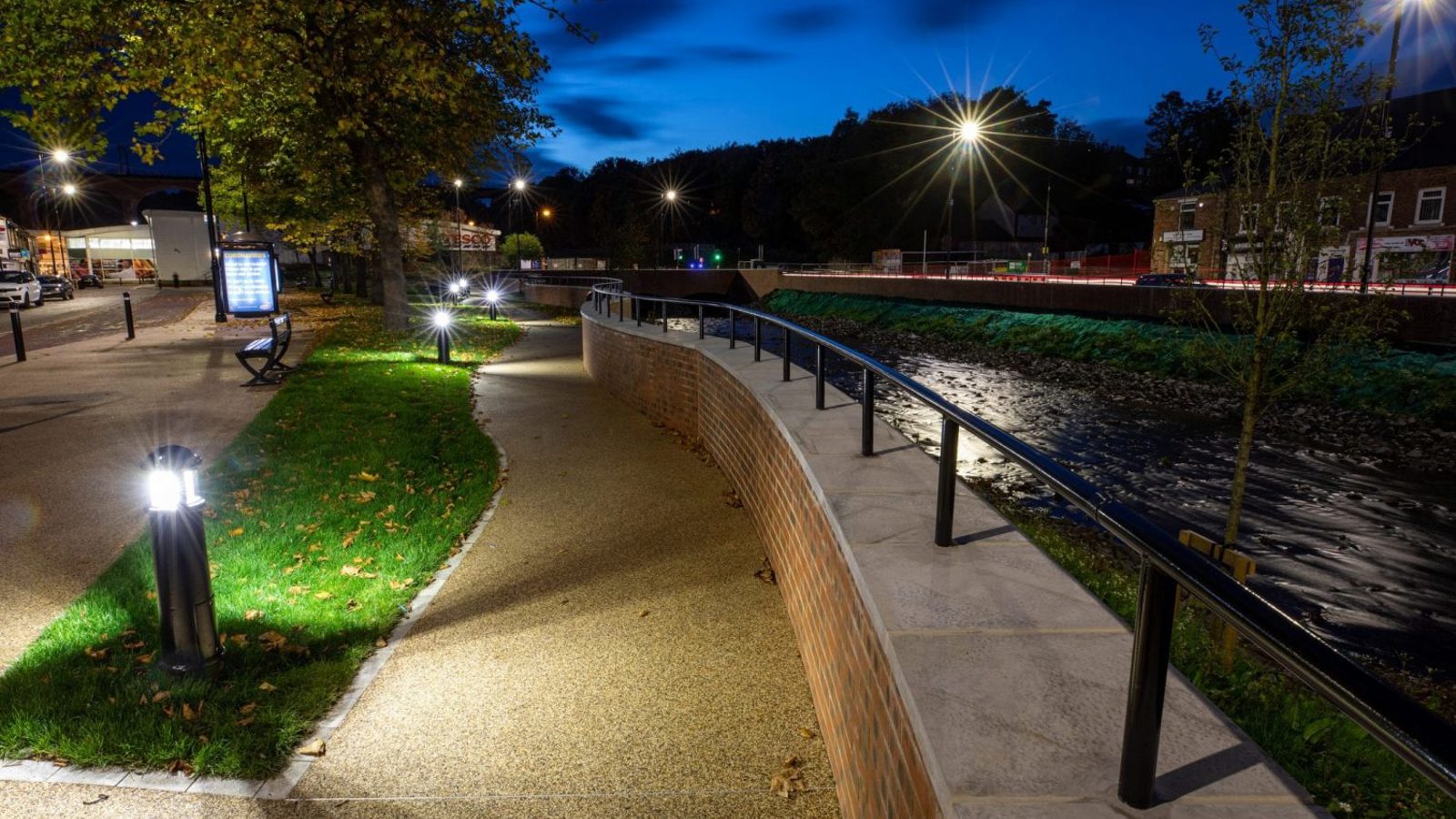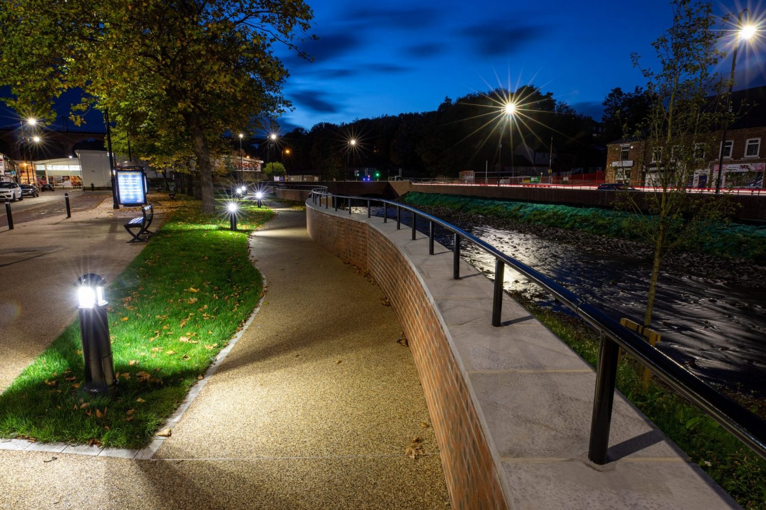 The re-opening of the watercourse – for the first time in 50 years – has enabled the creation of an enhanced and more welcoming appearance for the busy town centre. A revised market area nearer amenities features new seating and open spaces paved in Yorkstone. Surrounding the area there are bespoke underlit granite benches and planters, allowing a variety of uses for the space outside of market days.