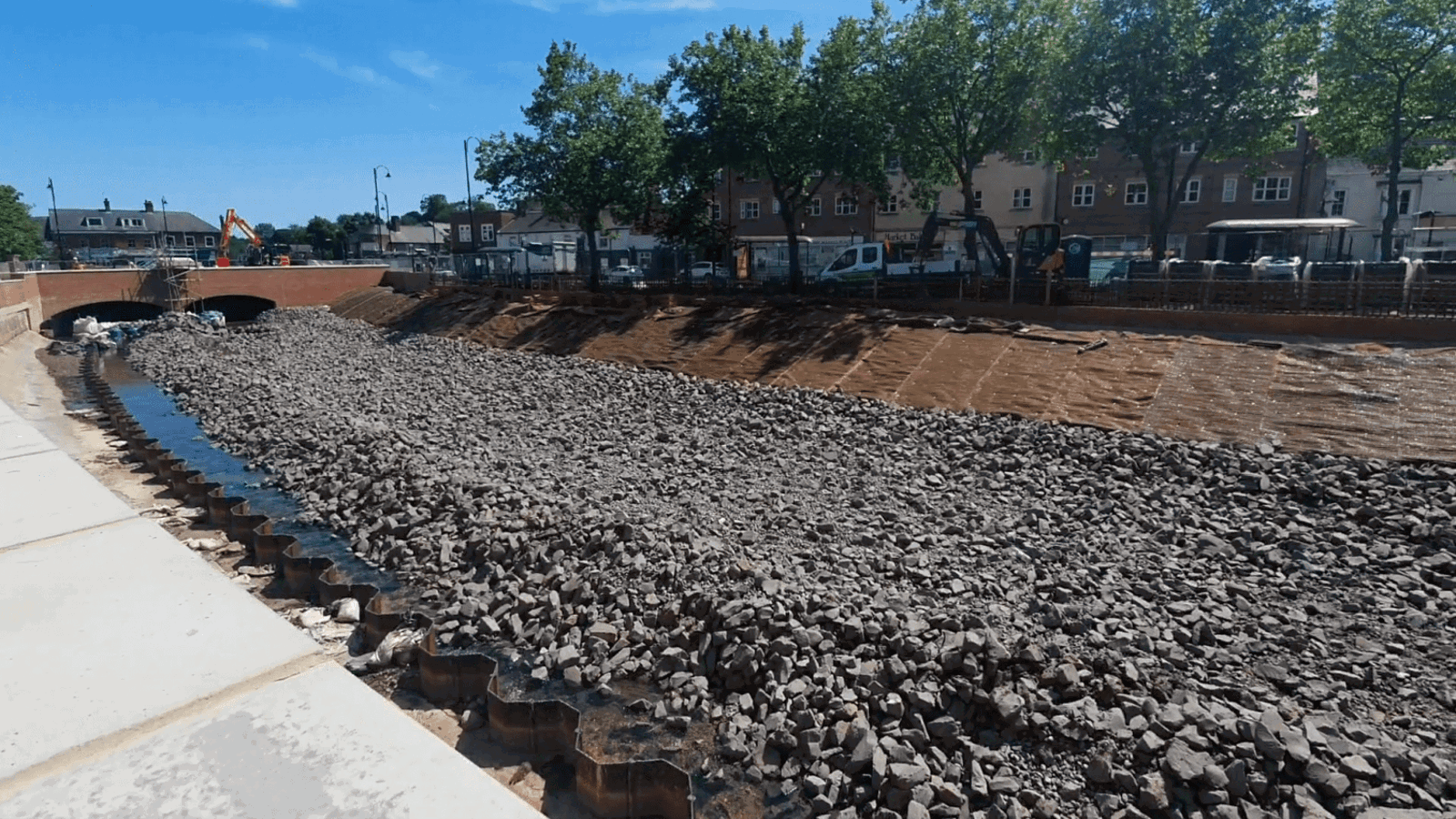 Work is ongoing to construct brick flood walls to the North and South of the river, and preparations are being made to create the North river bank. The South river bank has been covered with a topsoil retention matting to prevent erosion when the river flows are higher.