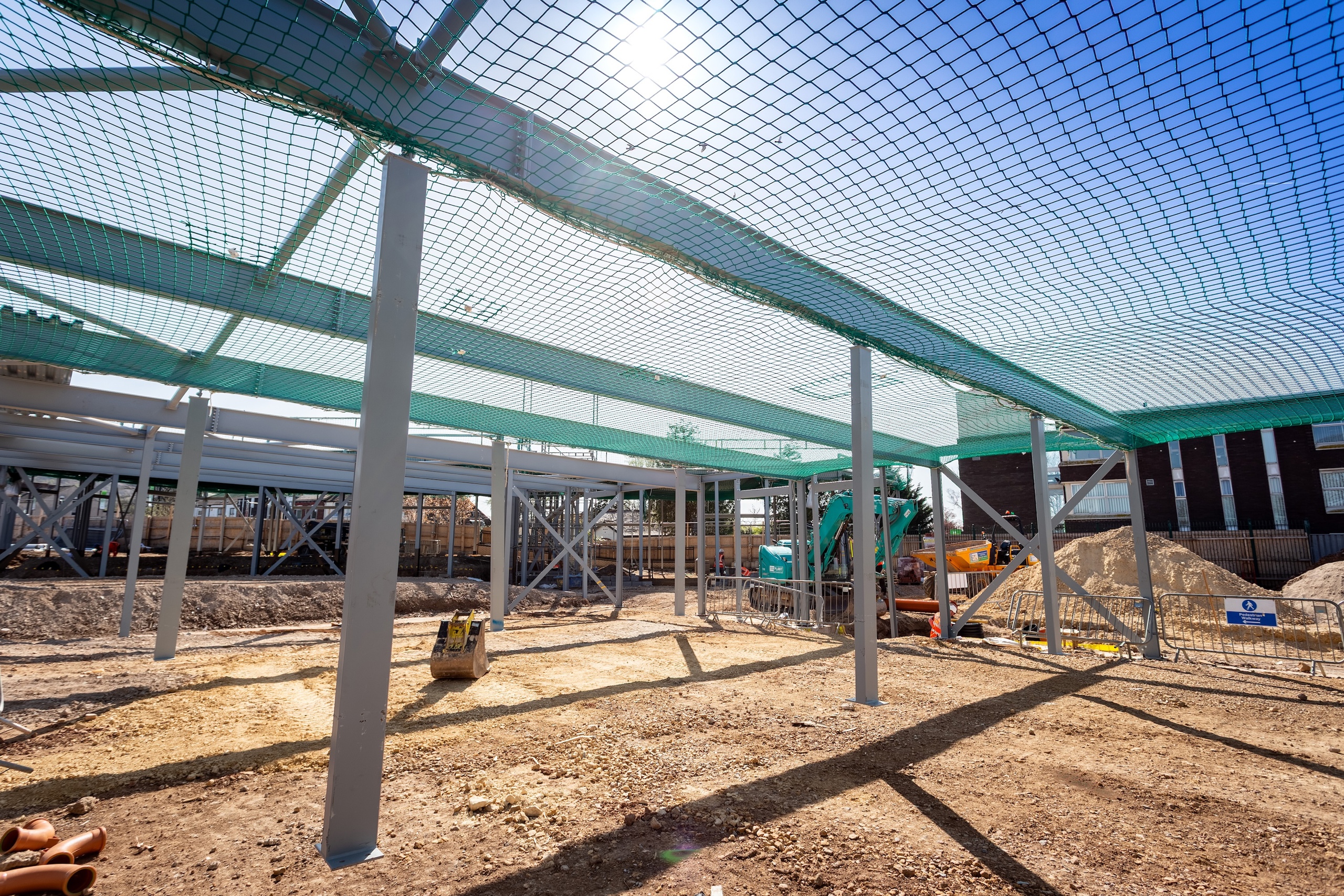 Since the demolition of the existing precinct completed and the latest phase of work commenced in January, the project has progressed significantly. All foundations have now been installed, including reinforced concrete with holding down bolts. Steel frames, weighing a total of 85 tonnes, were lifted into position using a 100-tonne crane, securing them into position to form the emerging structural frame. Once in place, the steel was lined and levelled ahead of grouting, while column encasements were used to provide essential protection and stability for the completed framework.