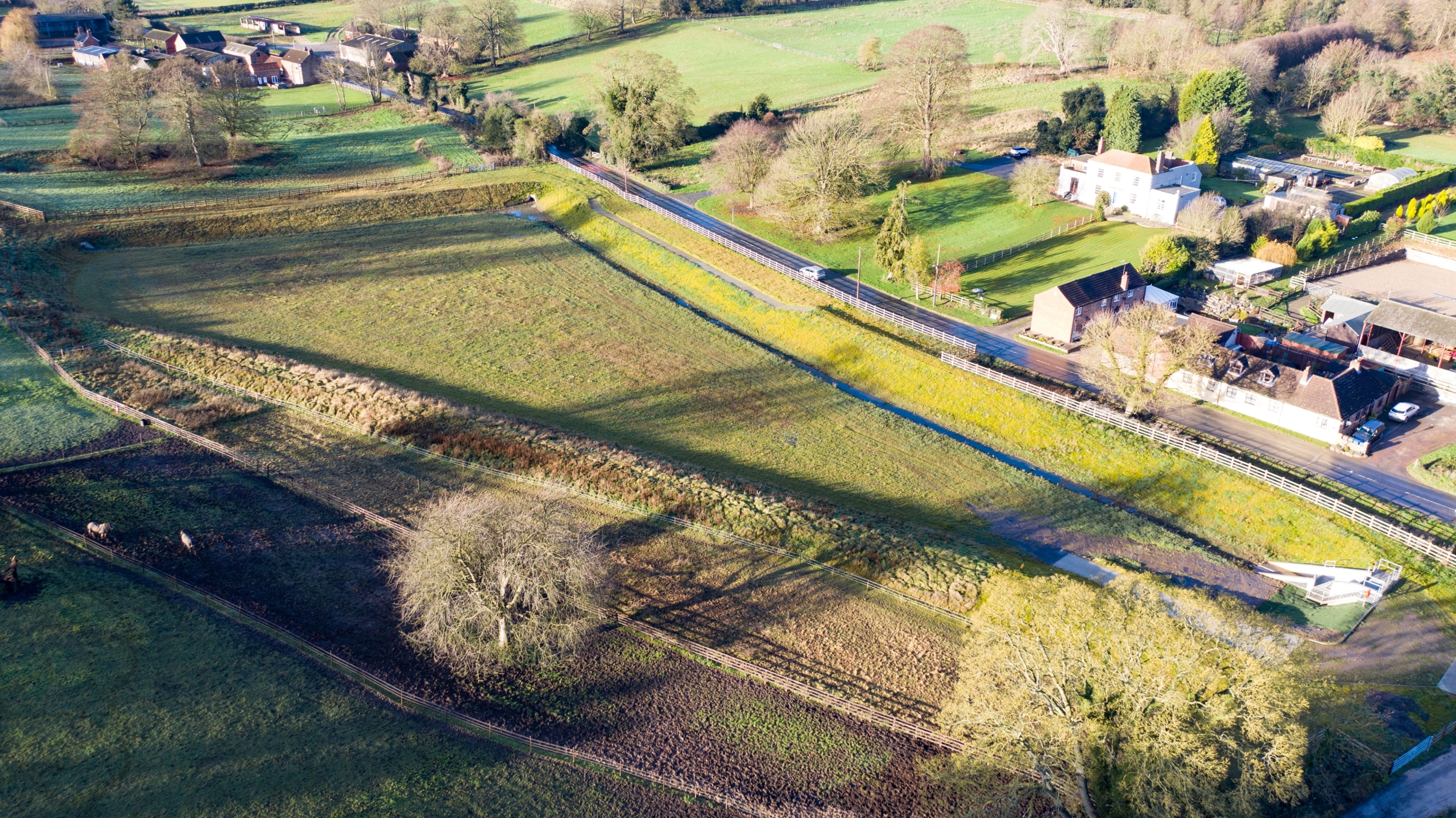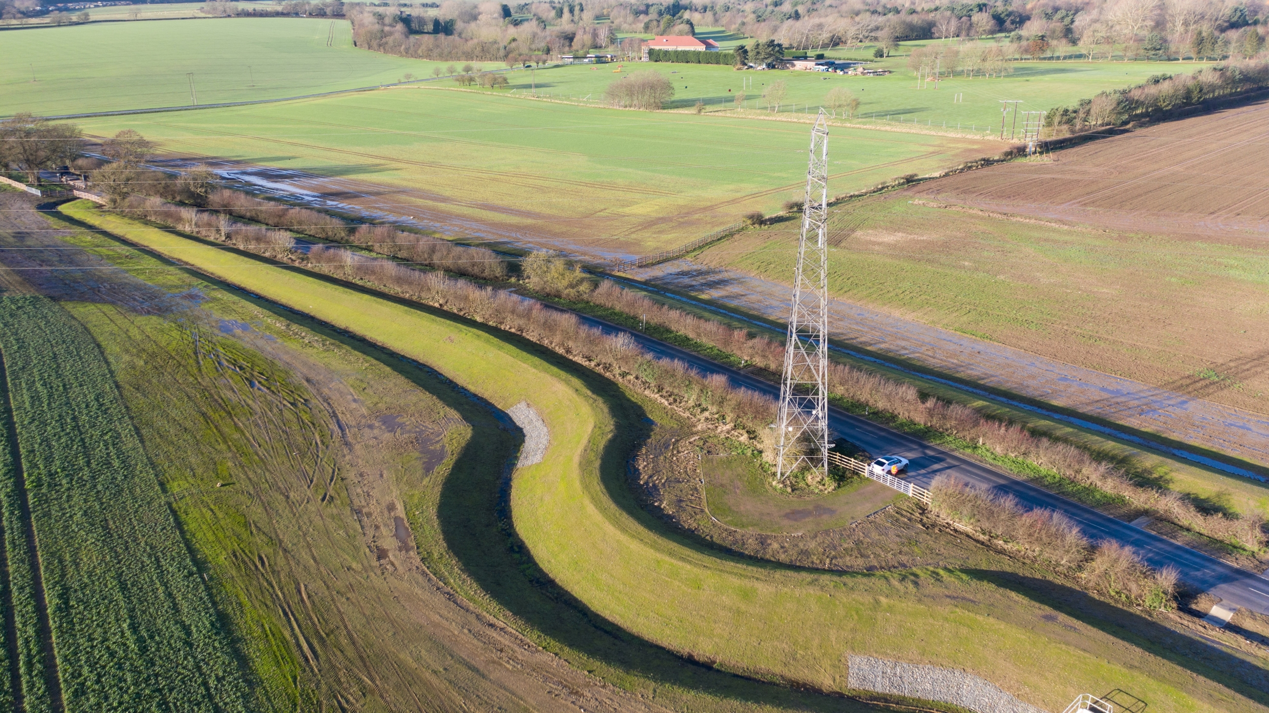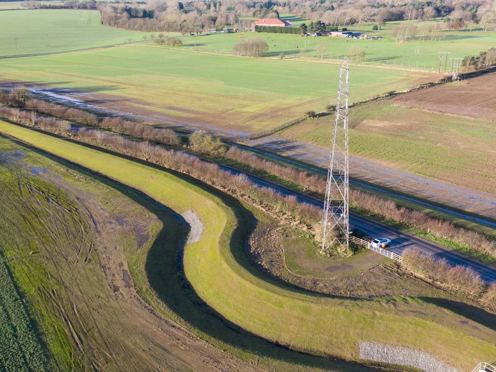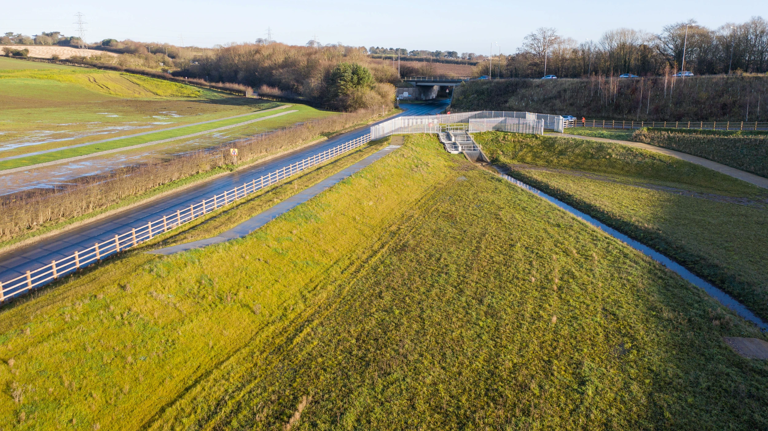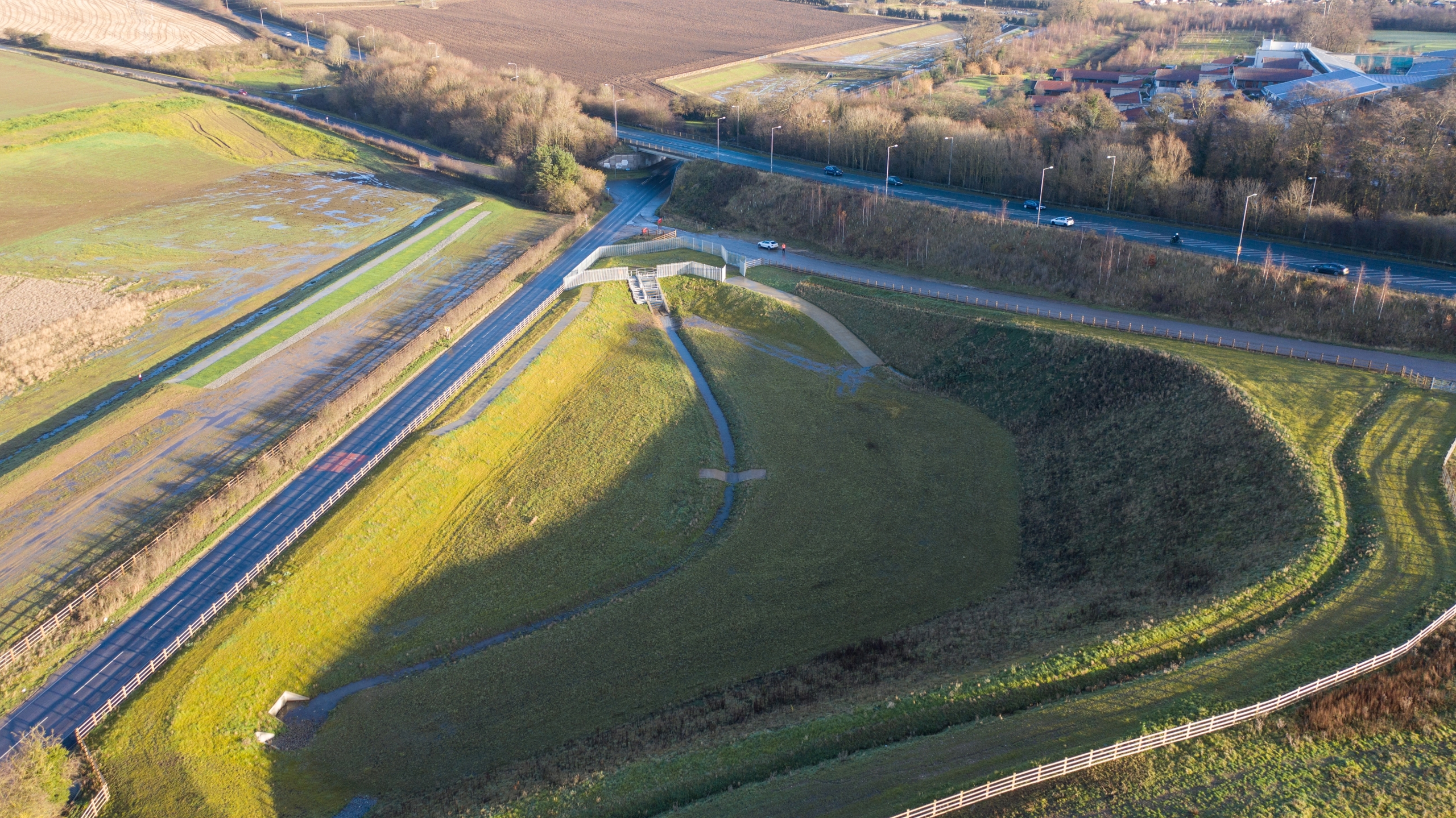 Eight cascading water attenuation lagoons with associated inlet and outlet structures were constructed in the £7.4 million project. The large-scale rainwater runoff storage solution has the capacity to store over 300,000 cubic metres of floodwater, which is the equivalent of 120 Olympic-sized swimming pools. The lagoons remain dry most of the time, enabling them to be farmed and crops planted.