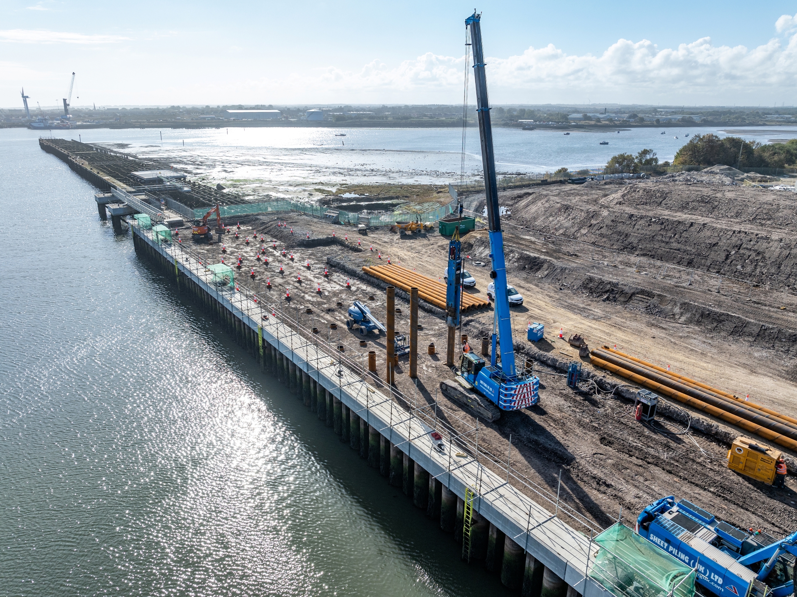 The £8.35 million transformation of the Ash Barge Dock at Northumberland Energy Park involved installing 173 tubular steel piles with a diameter of 610mm around the dock- side. The piles were driven to depths varying from 16m to 18.5m to support the main reinforced concrete relieving slab.