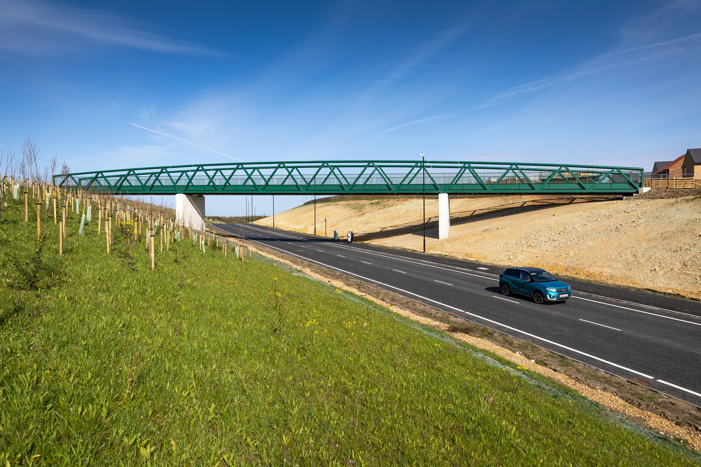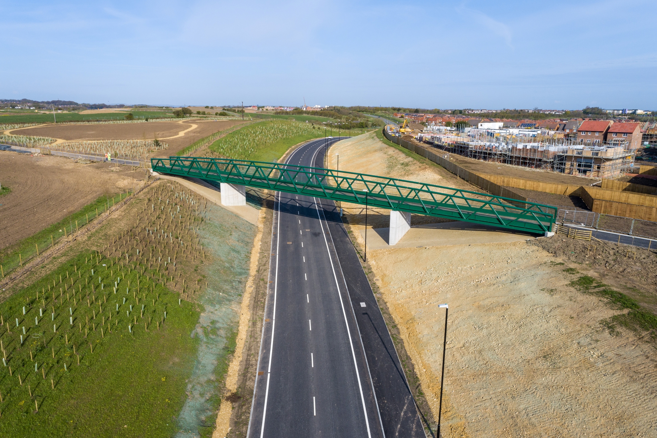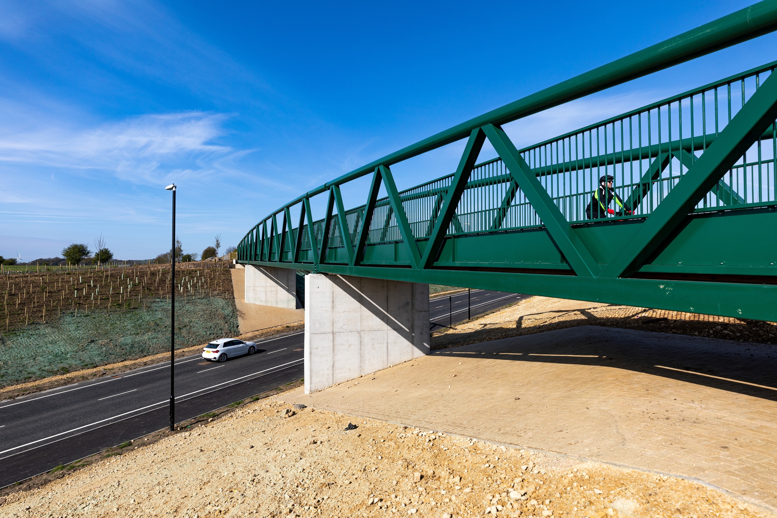 A 600m single carriageway and a Non-Motorised User bridge for pedestrians, cyclists, and equestrians was constructed, with the bridge built above the link road to enable the new highway to pass beneath an existing lane.