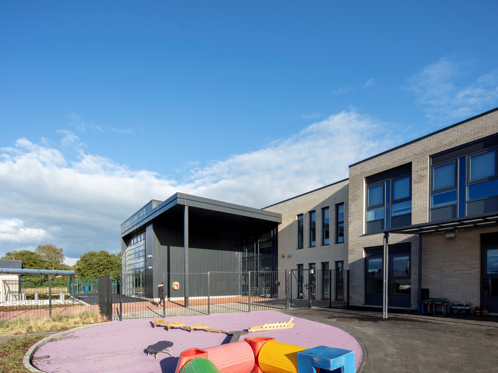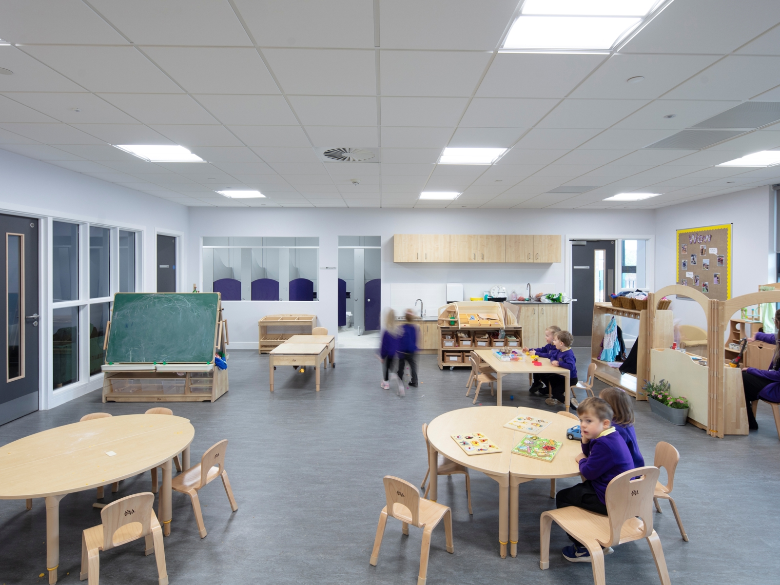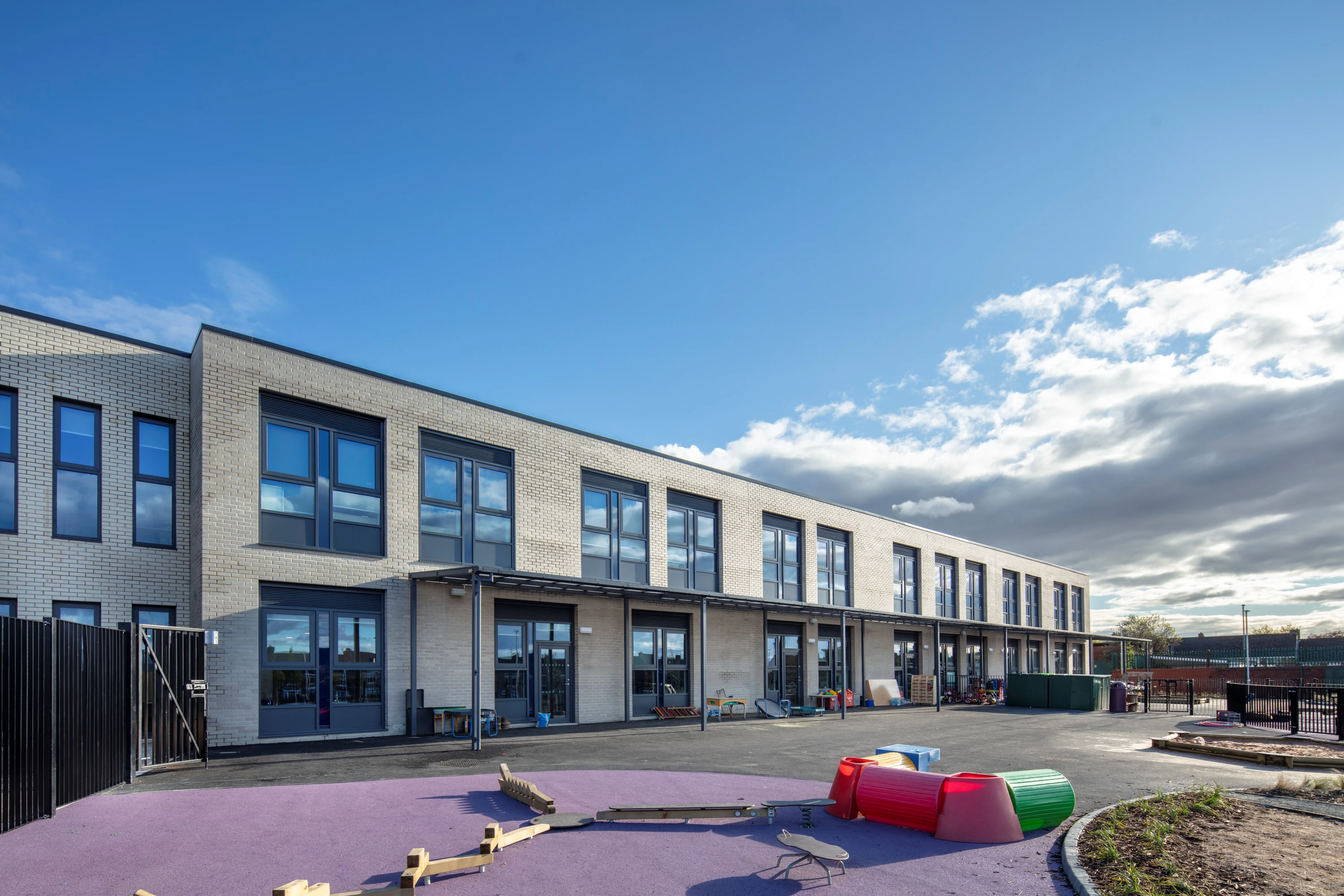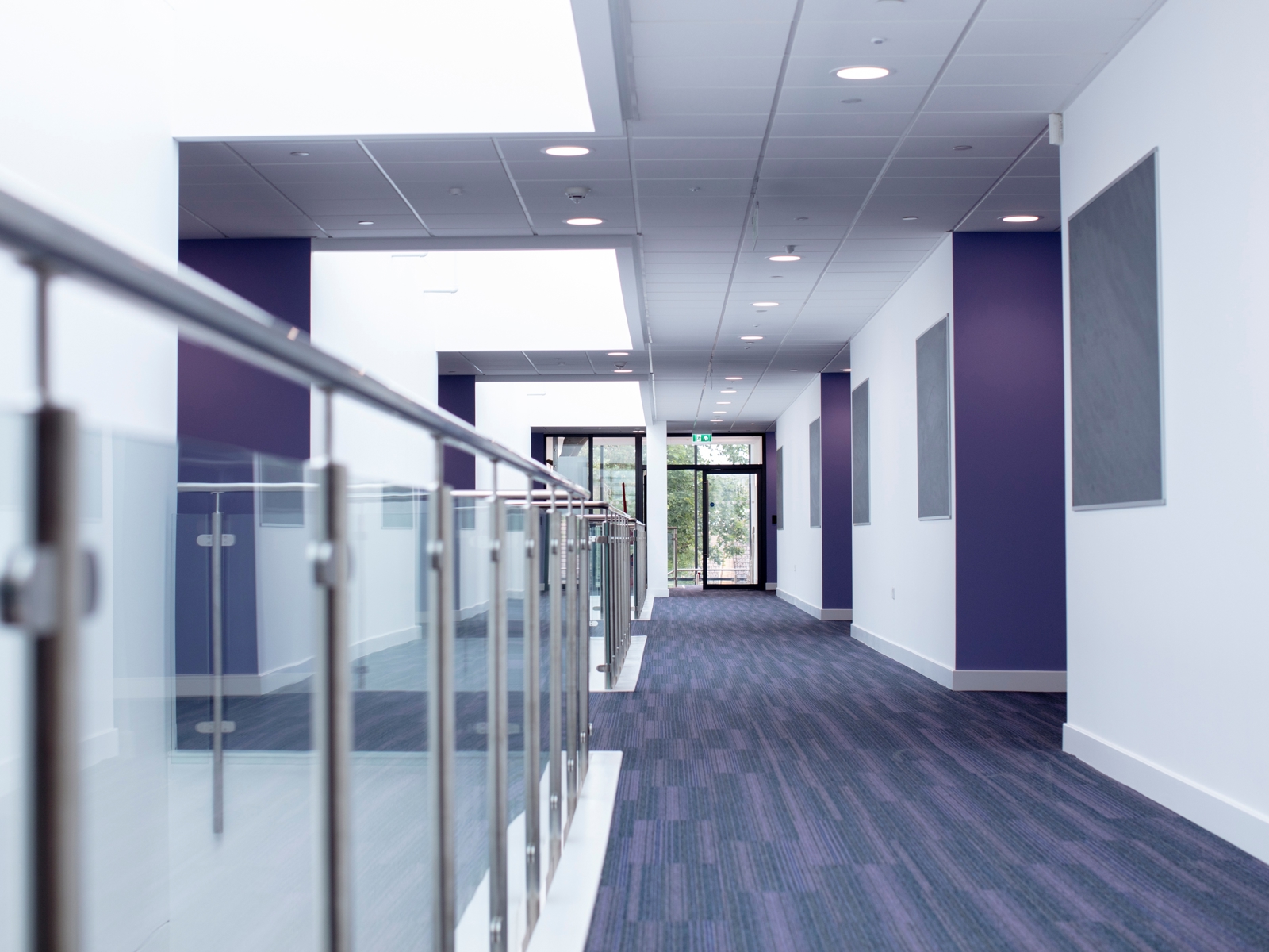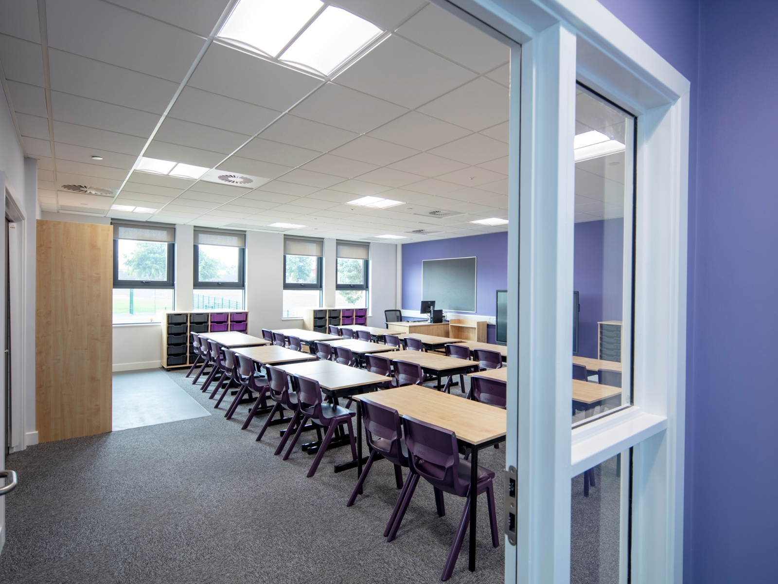 The fit-out internally included first and second fix joinery as 21 new teaching classrooms, a nursery, learning community suite, library, office spaces, staff room, toilet facilities, changing rooms, hall, and dining and kitchen facilities were installed.