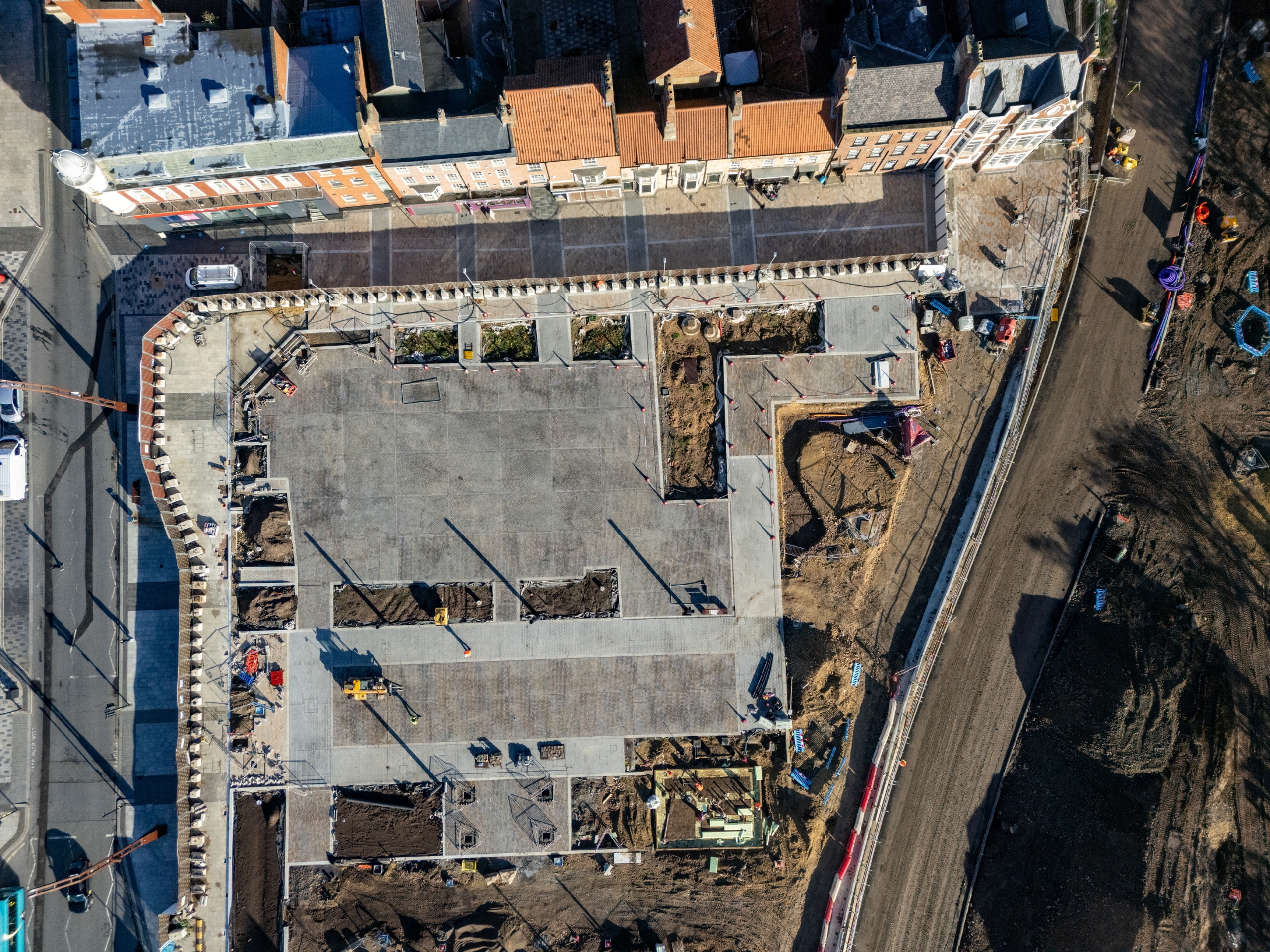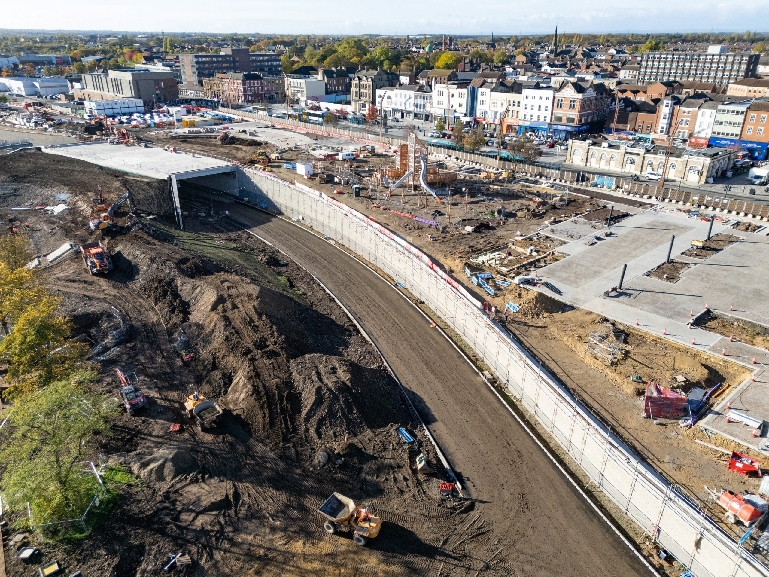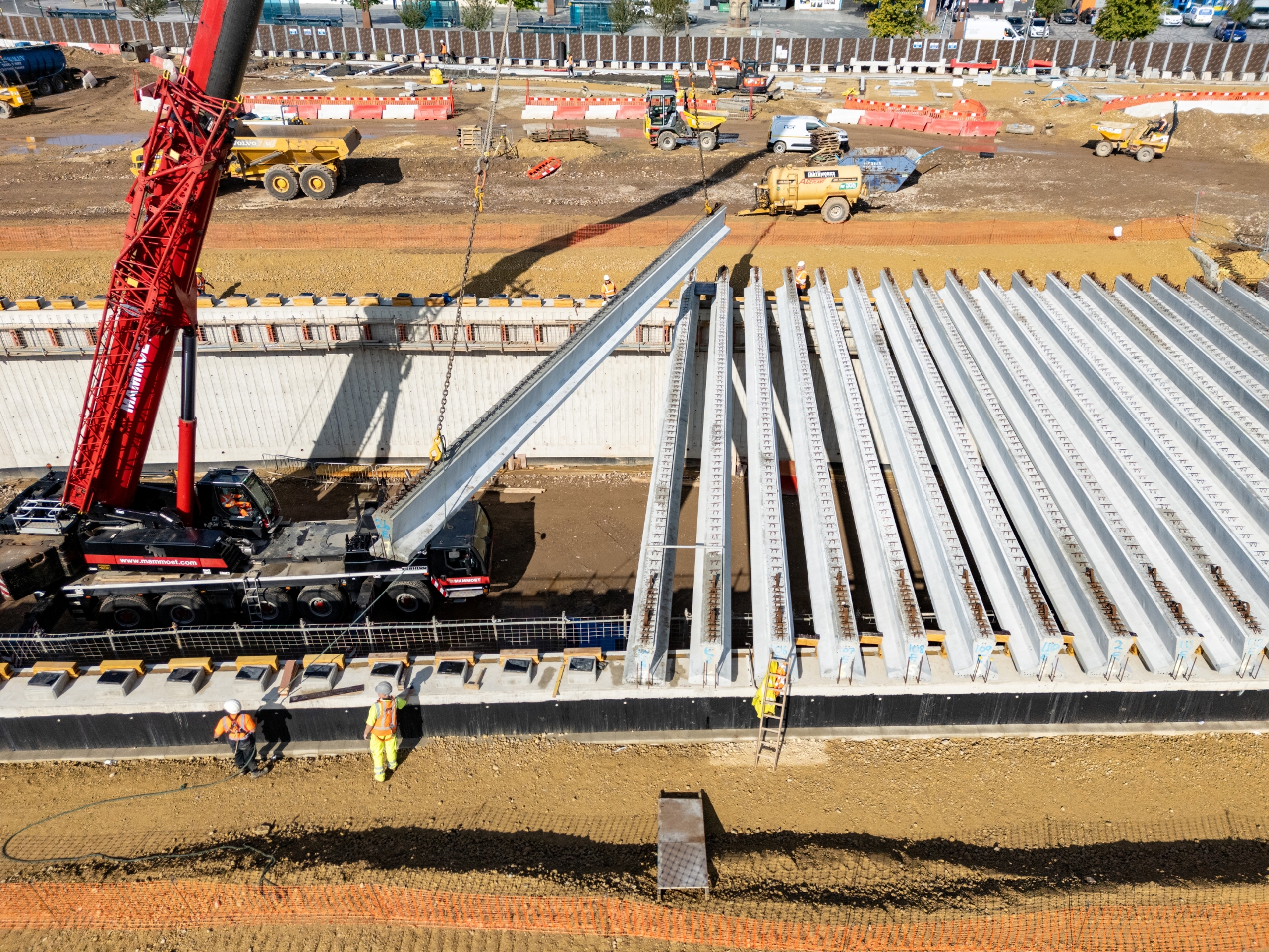 The centrepiece to the urban park is a land bridge spanning Riverside Road which provides uninterrupted access from the High Street to the river, with a 7m drop down to the lower park from the High Street via an accessible amphitheatre structure. 45 prestressed concrete bridge beams, measuring 21.5 metres in length and weighing 17 tonnes, were installed alongside two edge beams which weighed 35 tonnes each. More than 2,100m³ of concrete was poured to form the bridge deck.