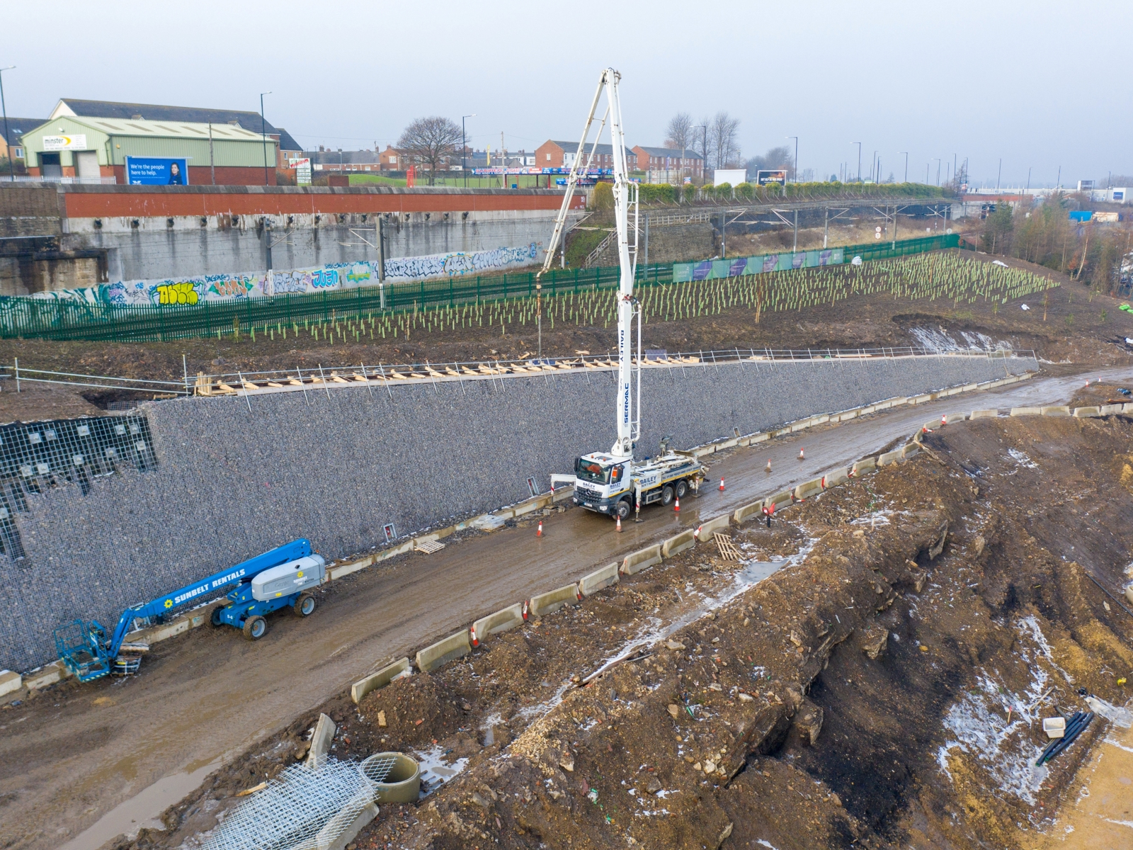 Over 1.6km of work was completed offline, most notably the construction of 500 metres of retaining structures. A soil nail wall, king post retaining wall and two reinforced concrete retaining walls were required given a 20-metre height difference separated the bordering land.