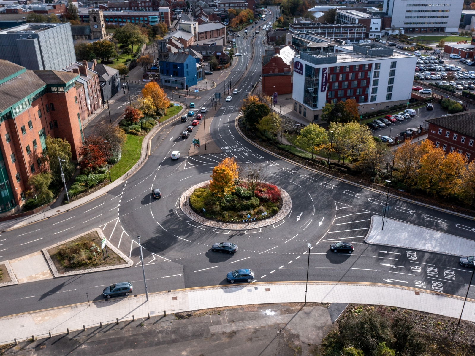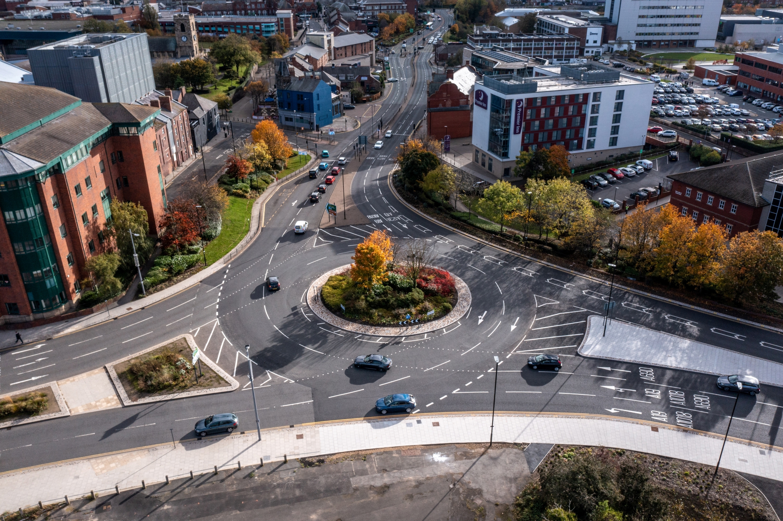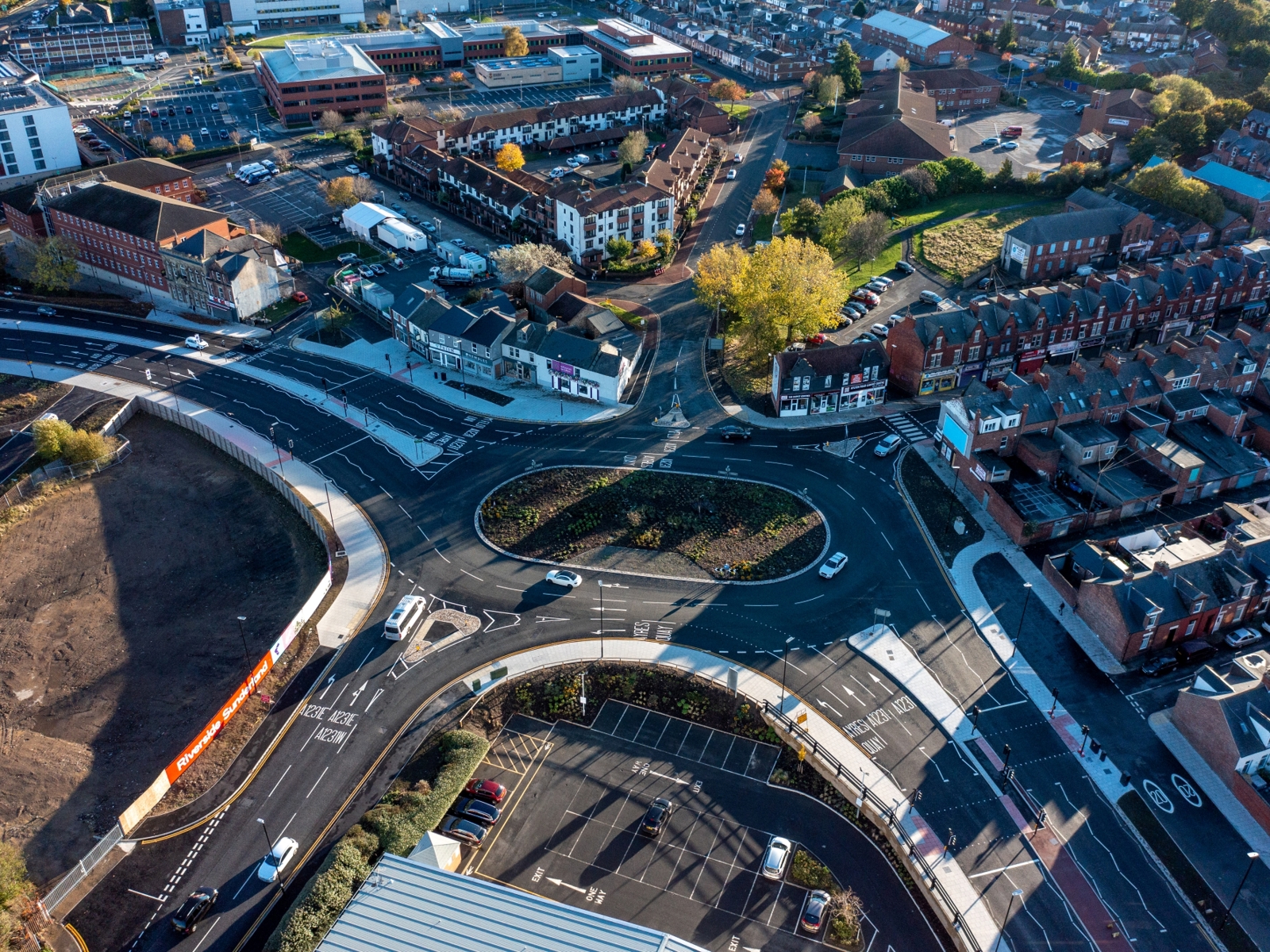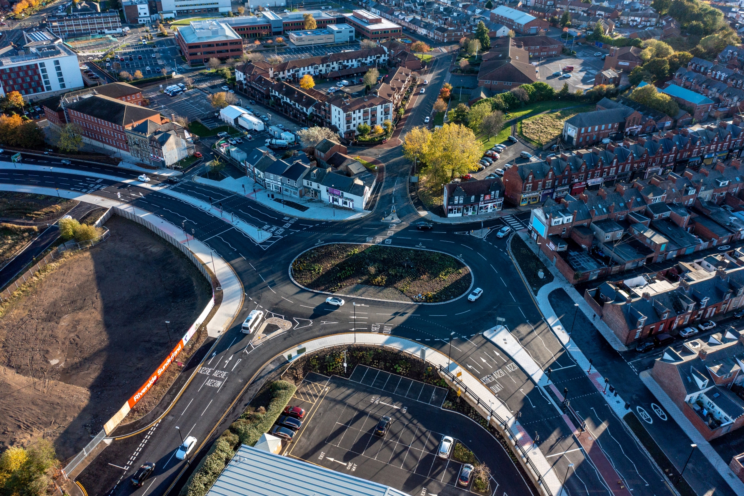 Access had to be maintained on this key commuter route through the city centre while working online. Existing highways were widened and realigned between retail and residential areas, roundabout improvements were undertaken and new junctions were constructed, as well as shared use footpath and cycleways throughout.