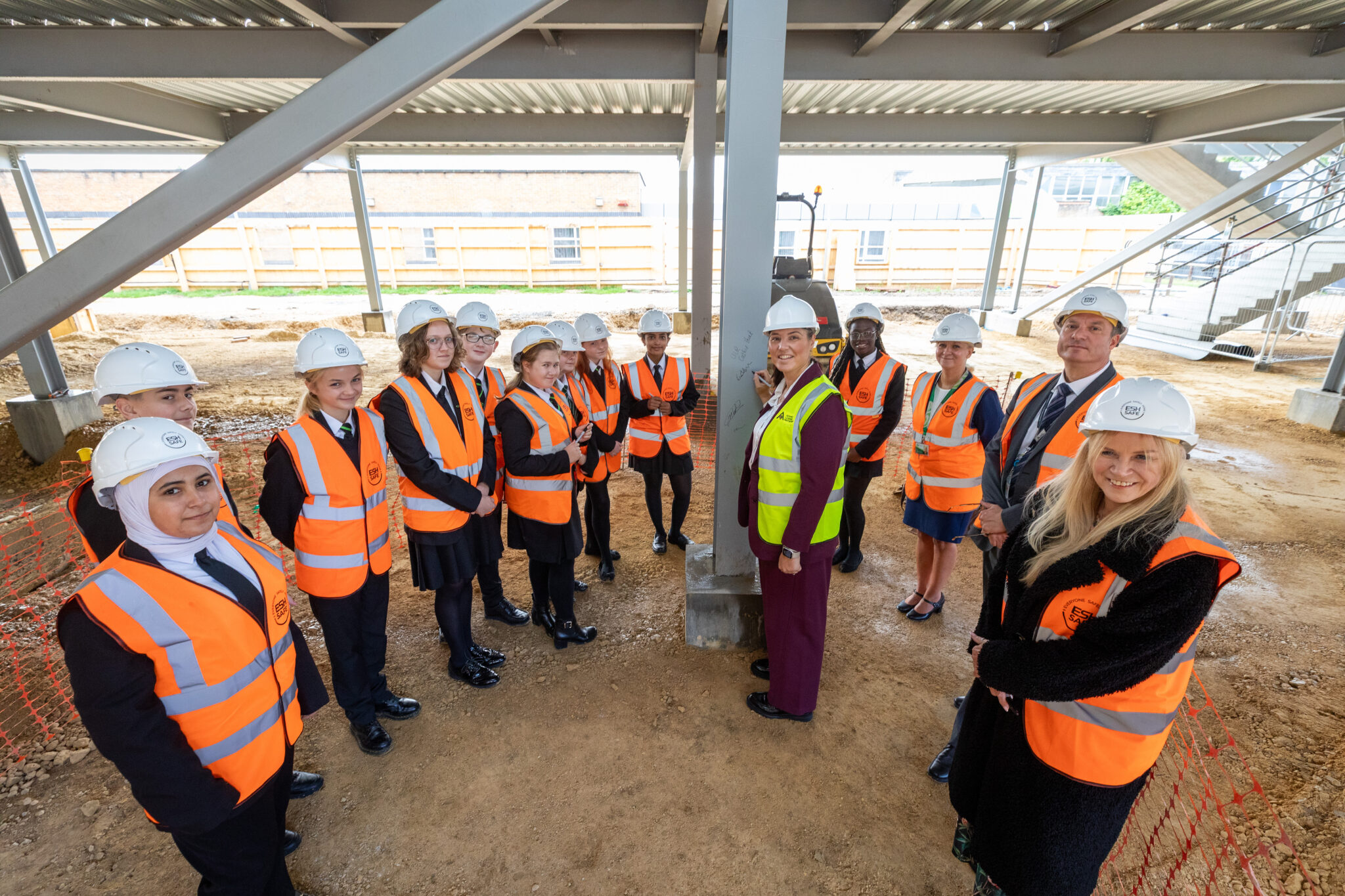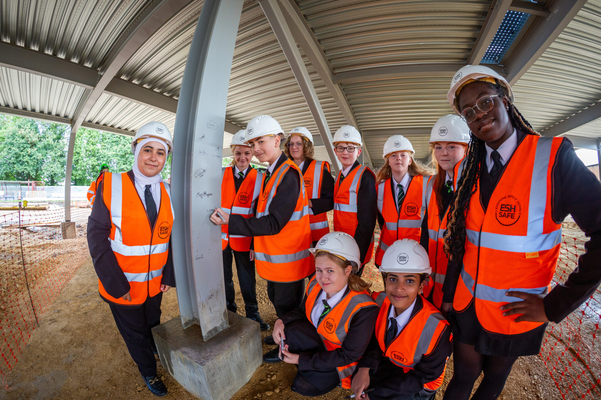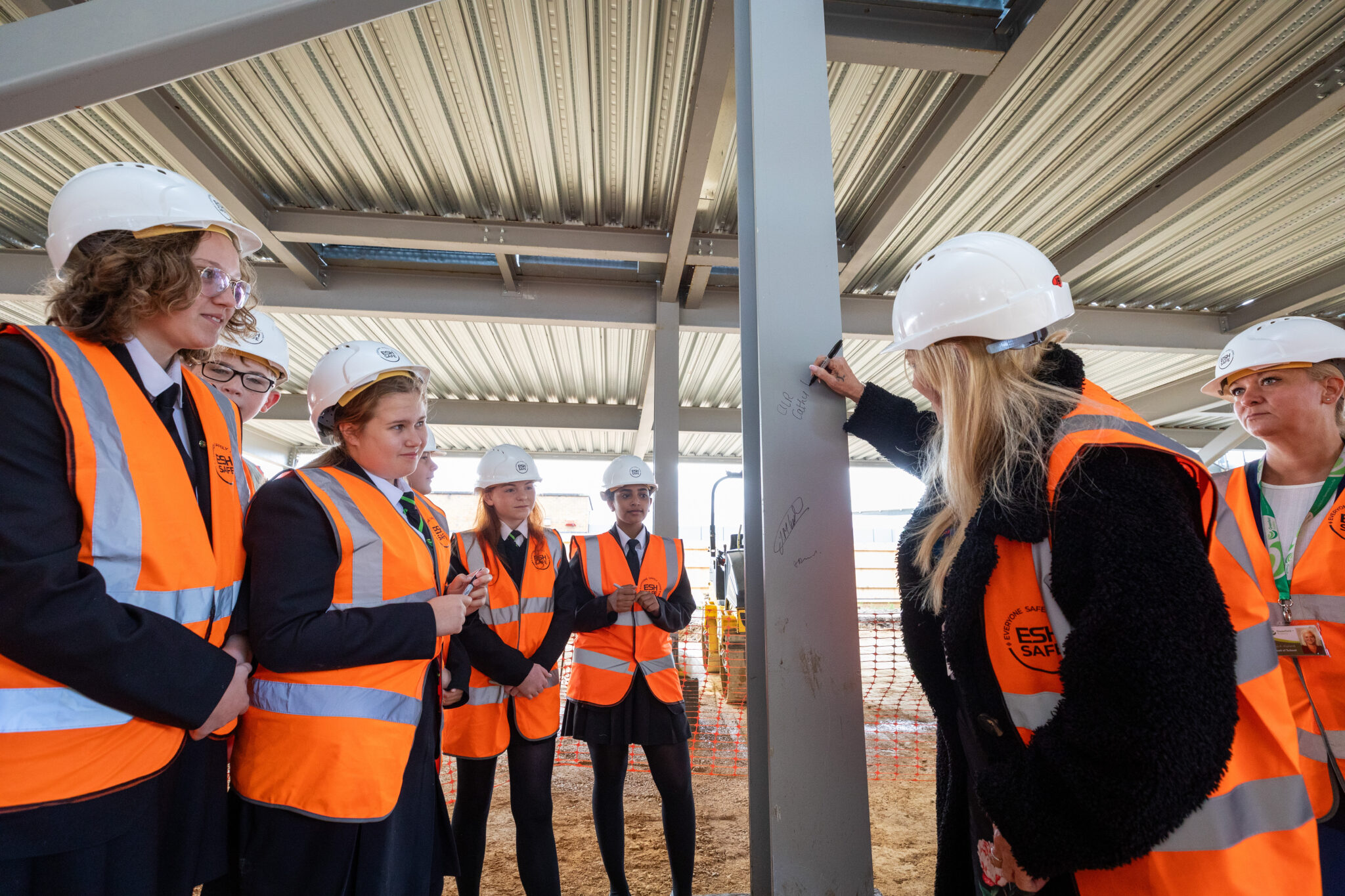 Among those etching their signature on the steel frame were Durham County Council’s Cabinet member for children and young people’s services, Cllr Cathy Hunt, James Keating, Executive Headteacher, and Amy Aspland, Head of School at Greenfield Academy, as well as 10 students from the academy’s ‘Greenfield Gazette’ newspaper team, and senior representatives from Esh Construction and AtkinsRealis.